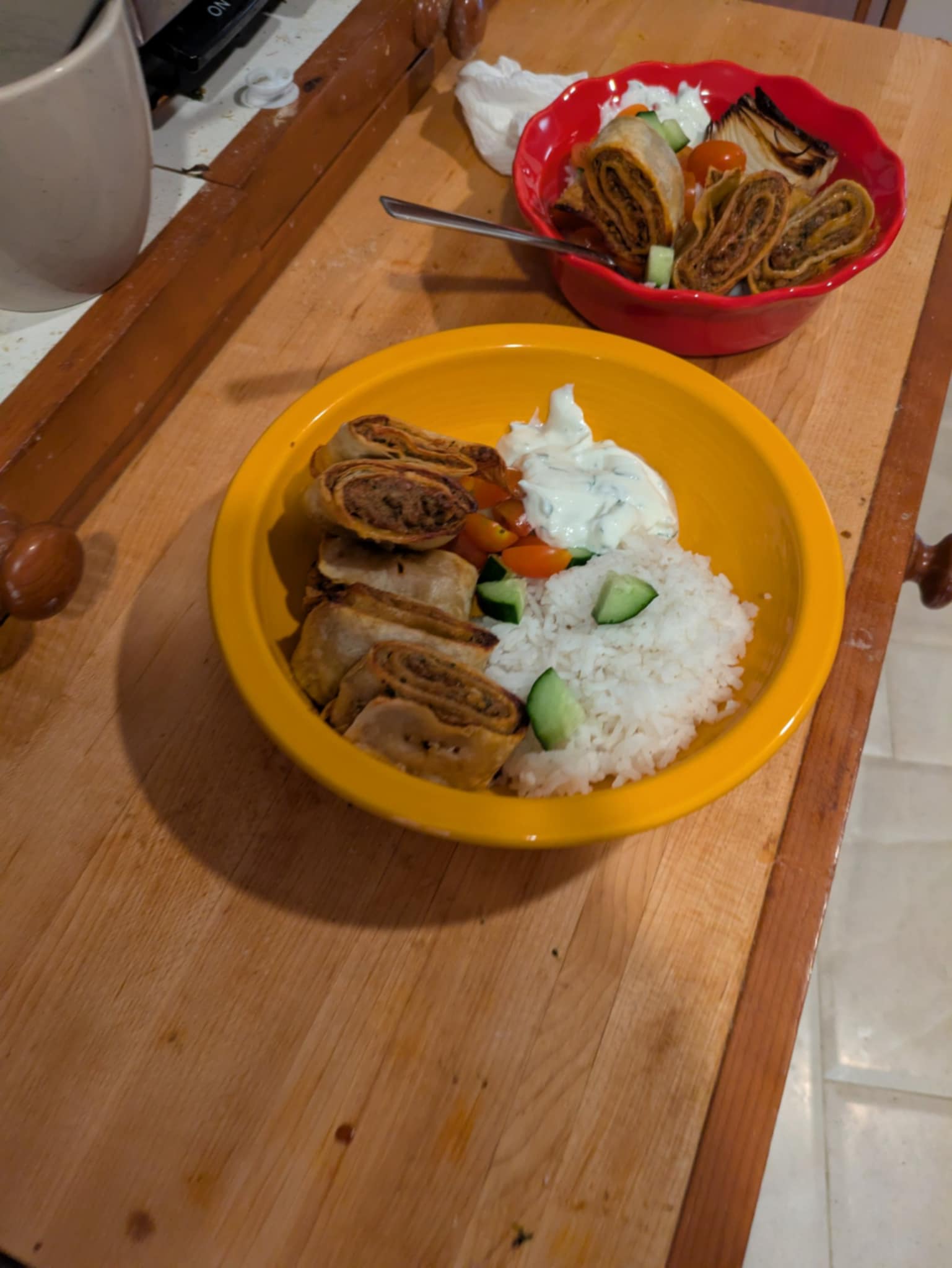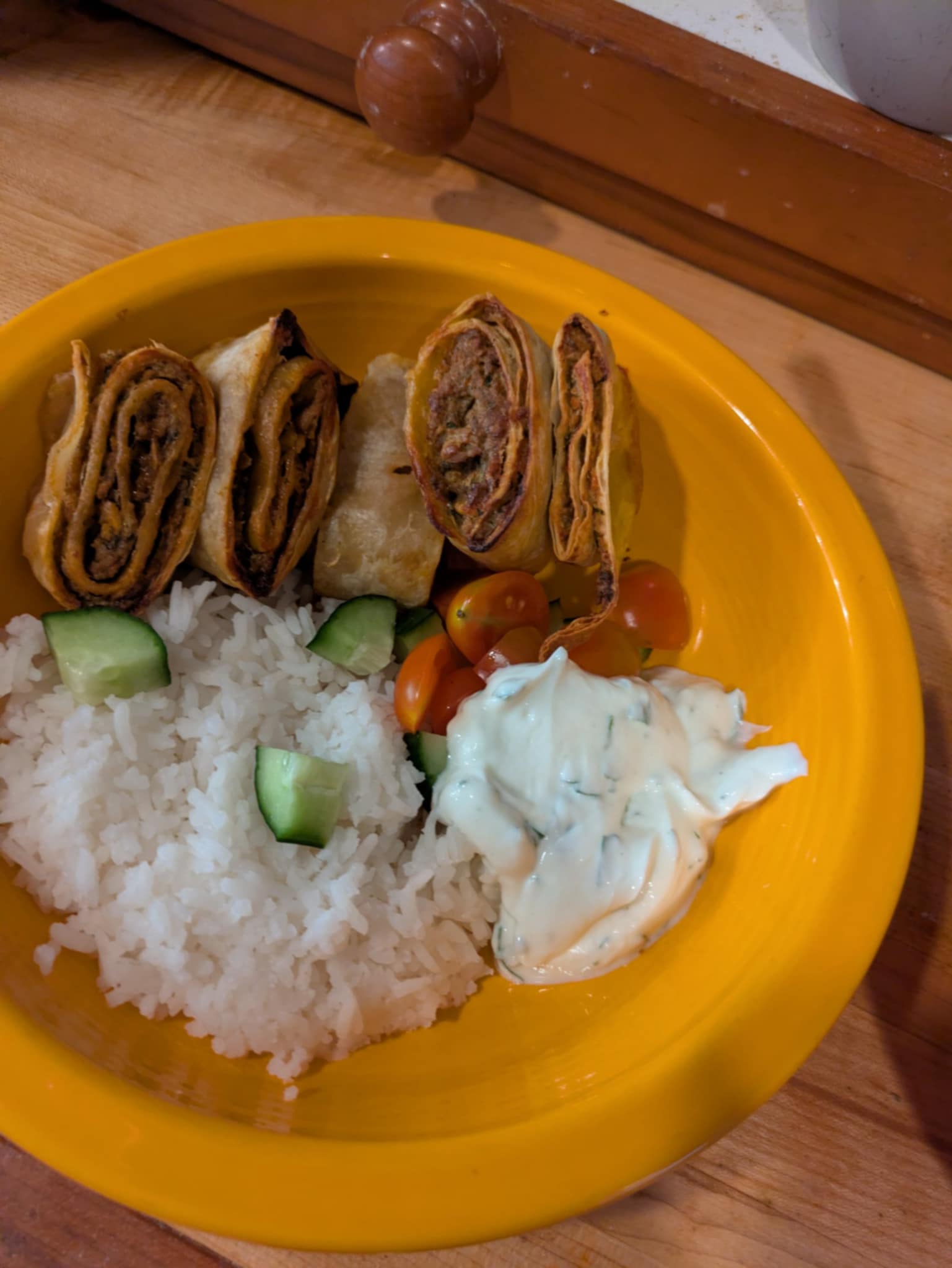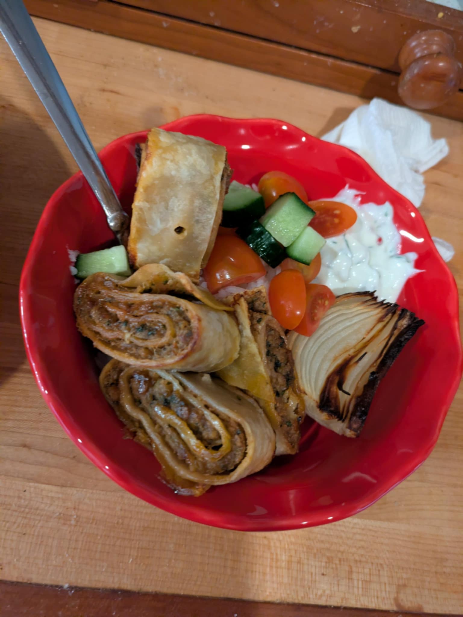 Serve the kofta pinwheels over rice with cucumber, tomato, grilled onion, and a generous spoon of the lemon-parsley yogurt sauce.