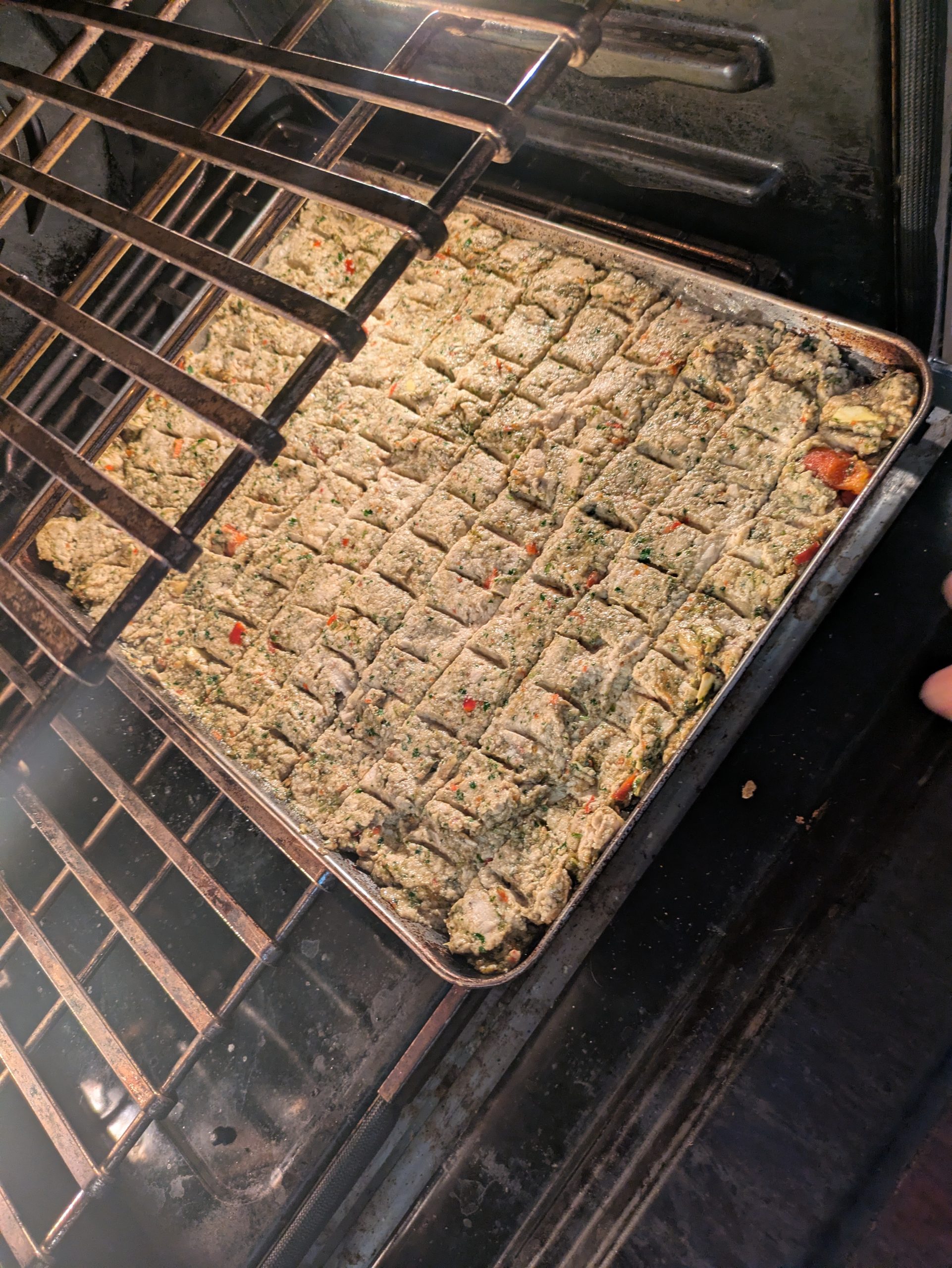 Press the mince mixture into a greased sheet pan, then using a spatula or pastry scraper cut into strips about an inch and half wide. Then make smaller dents down each strip to simulate the look of a kabob.
