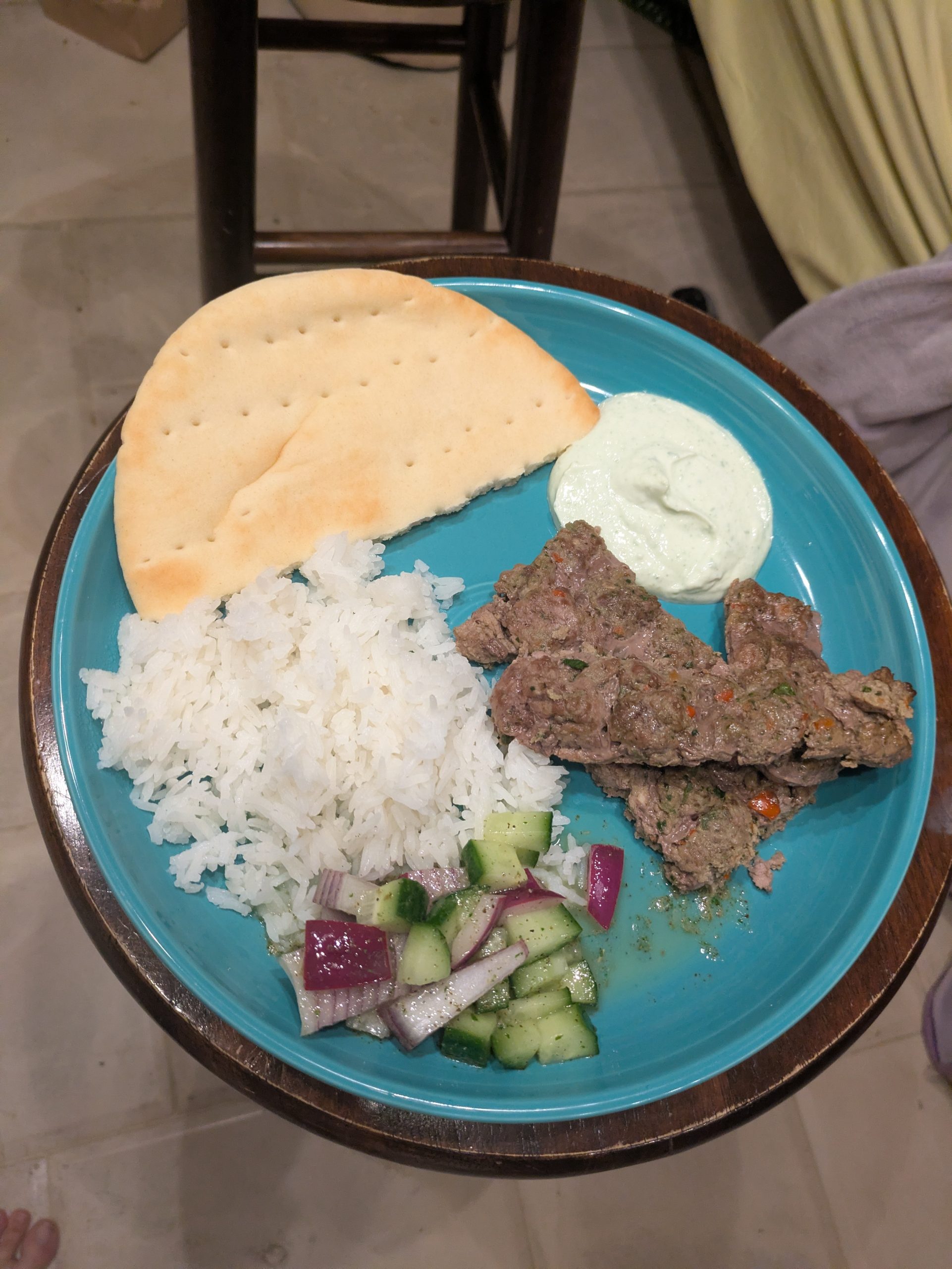 An easy way to make a baked mince that resembles a ground meat kabob. We made two versions for our multigen family. One with minced beef (we actually took a tri tip and minced it in the food processor) and one used Gardein Chicken Strips. Both were seasoned with the same mixture and served with the same sauces, making meal prep easy.