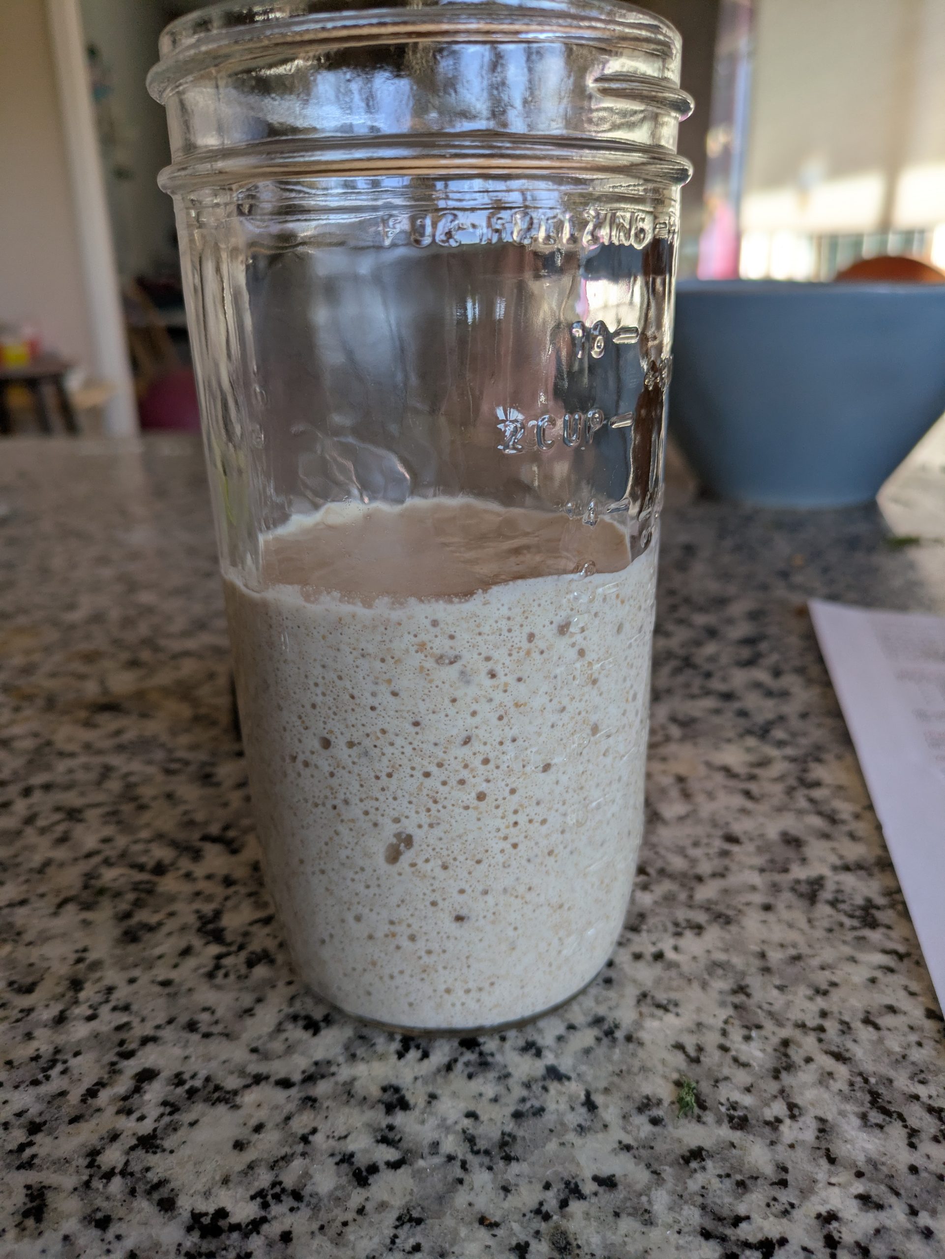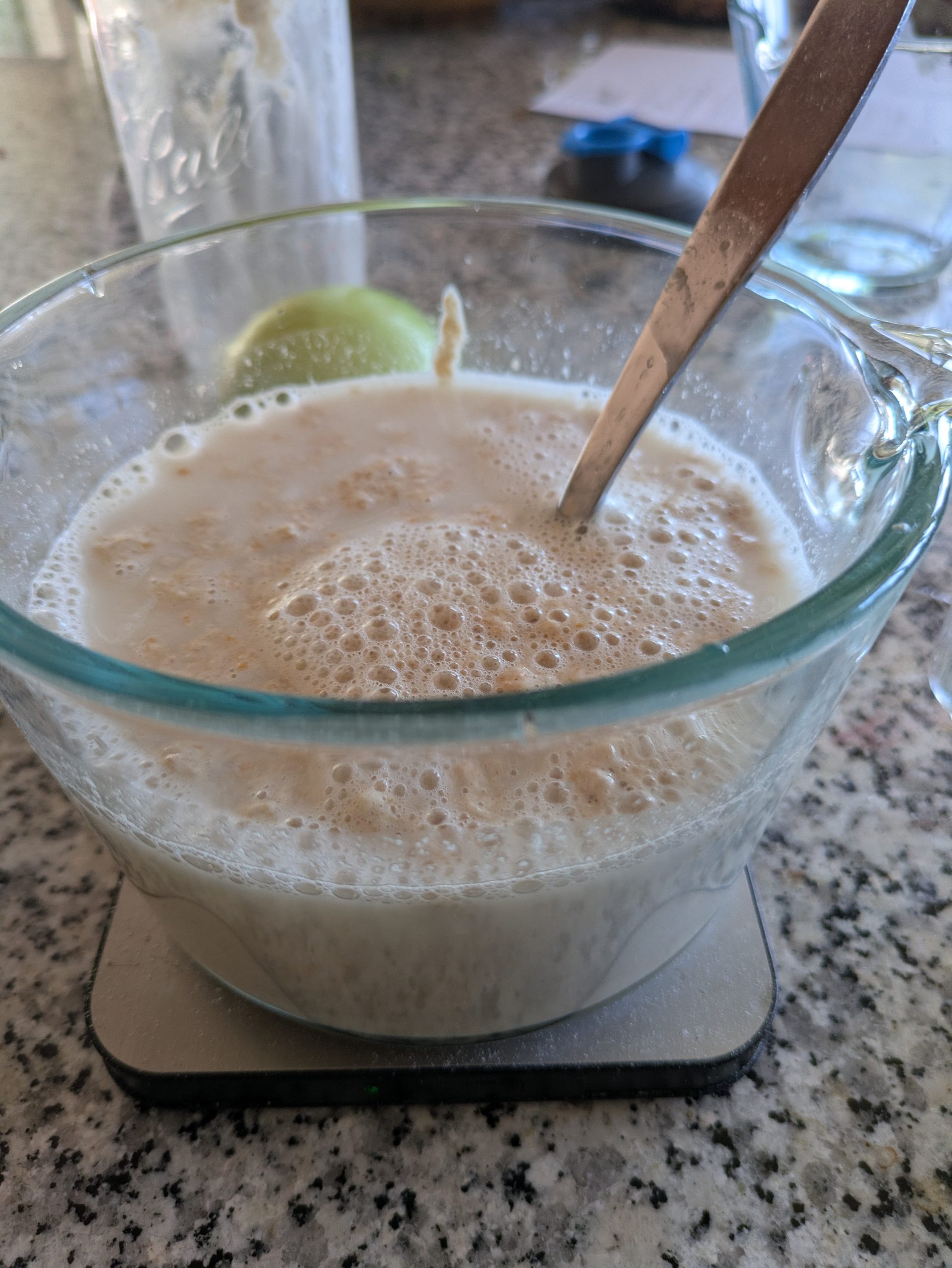 I had about 80 grams of starter, I fed a 1:1:1 ratio, so 80 grams of warm water and 80 grams of fresh spelt flour. Mixed well and let that sit on the counter until later morning,