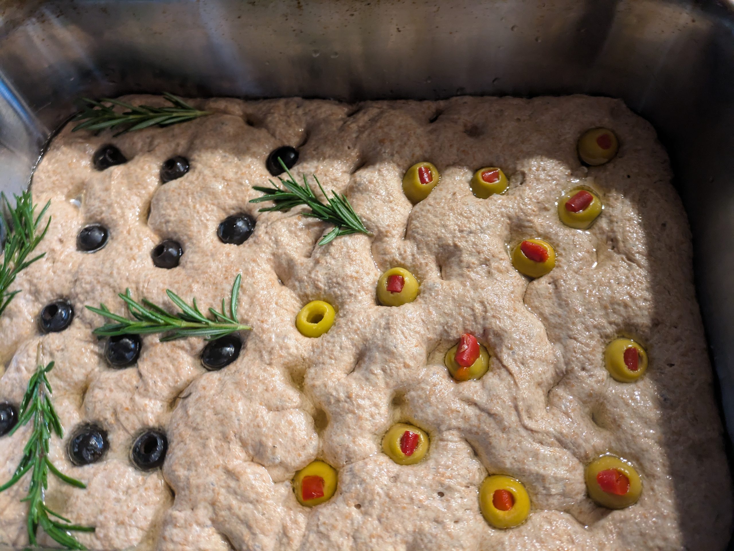 Near the end of the rise, dimple deeply with oiled fingers. Add olives, rosemary, flaky salt, and a generous drizzle of olive oil.